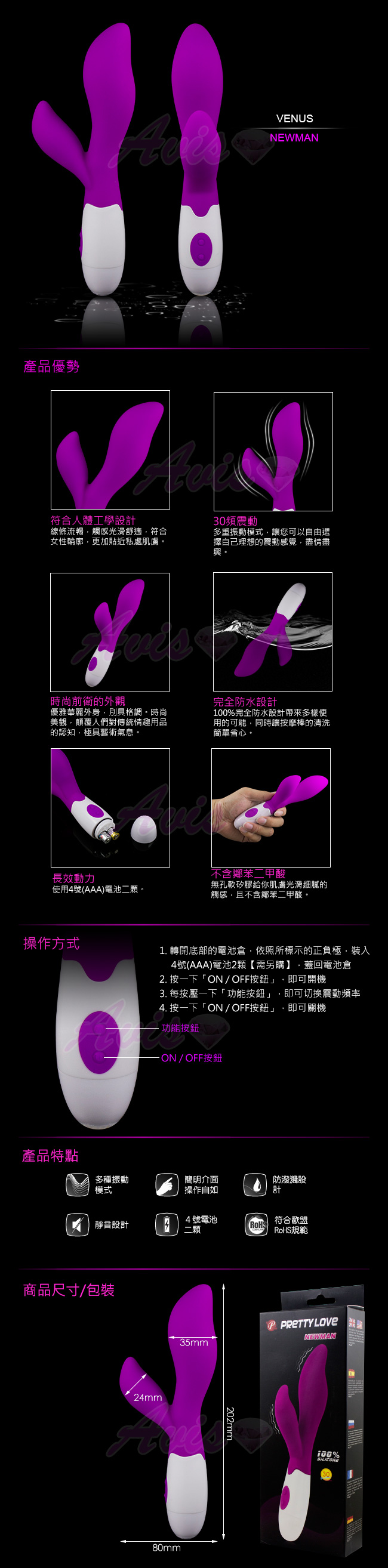 .主商品:NEWMAN 紐曼-多功能雙震動 30頻 時尚精品智能按摩棒-紫x1